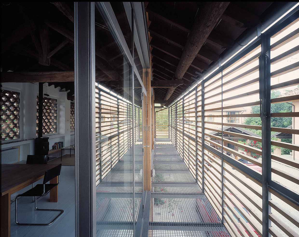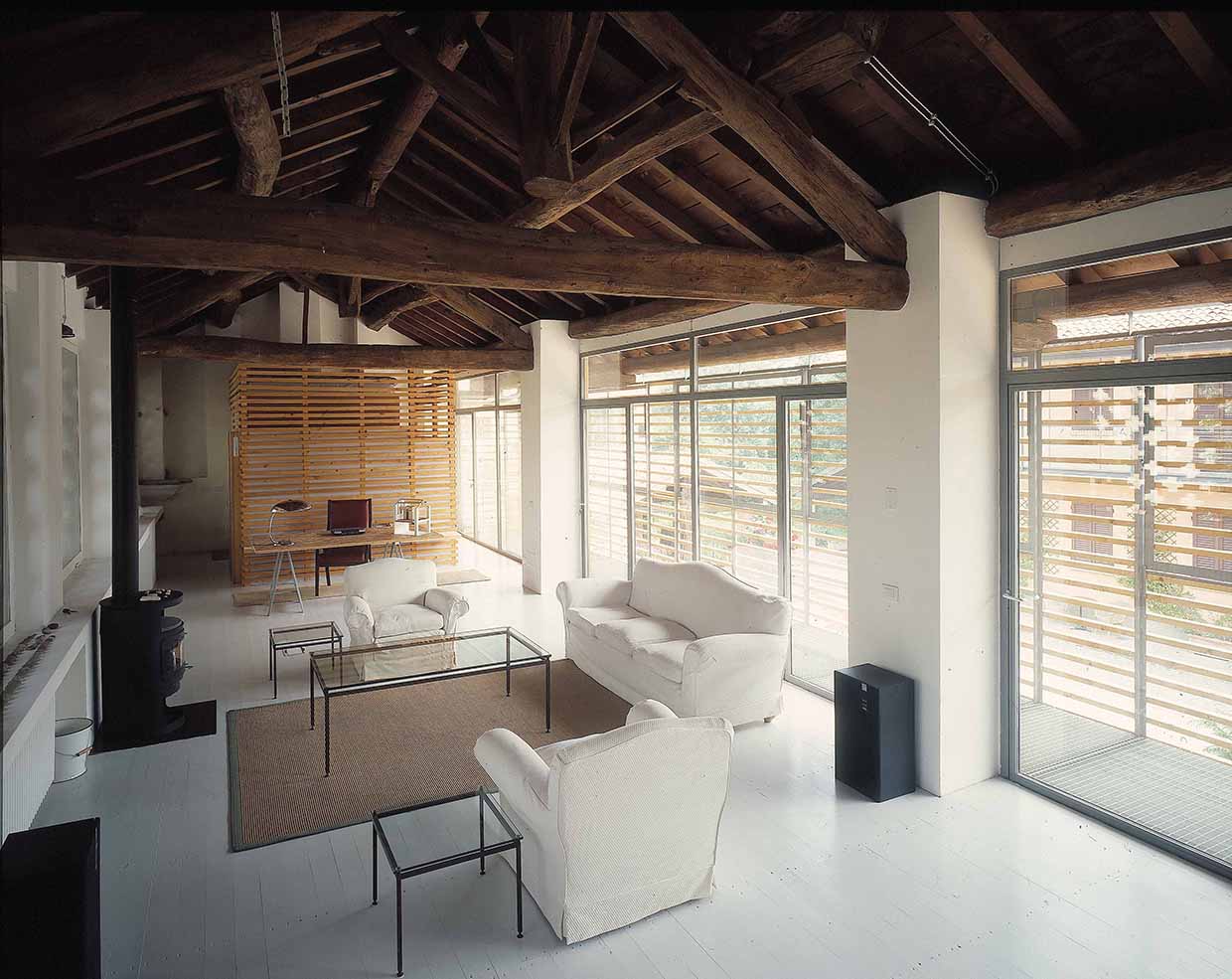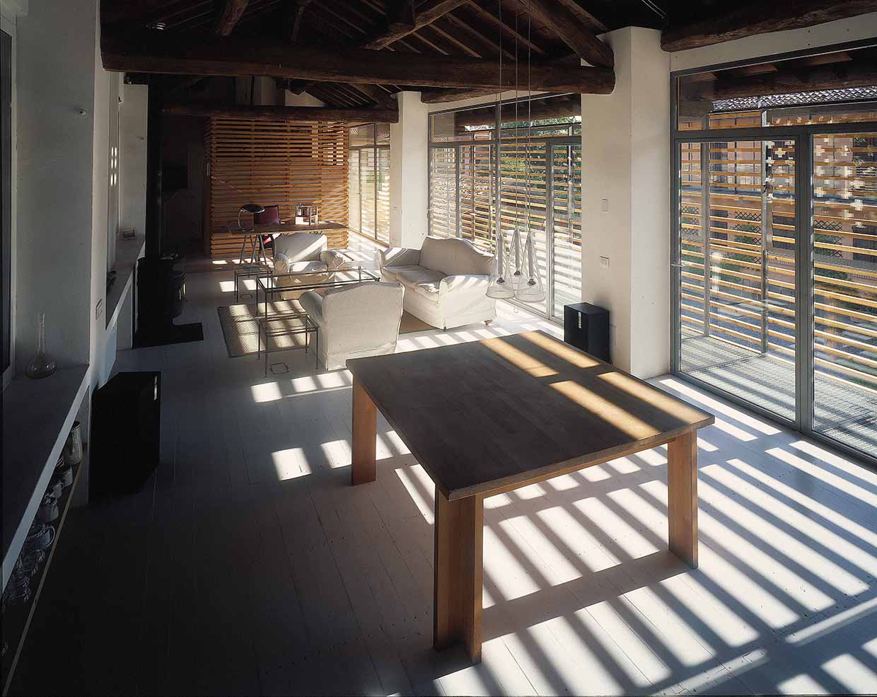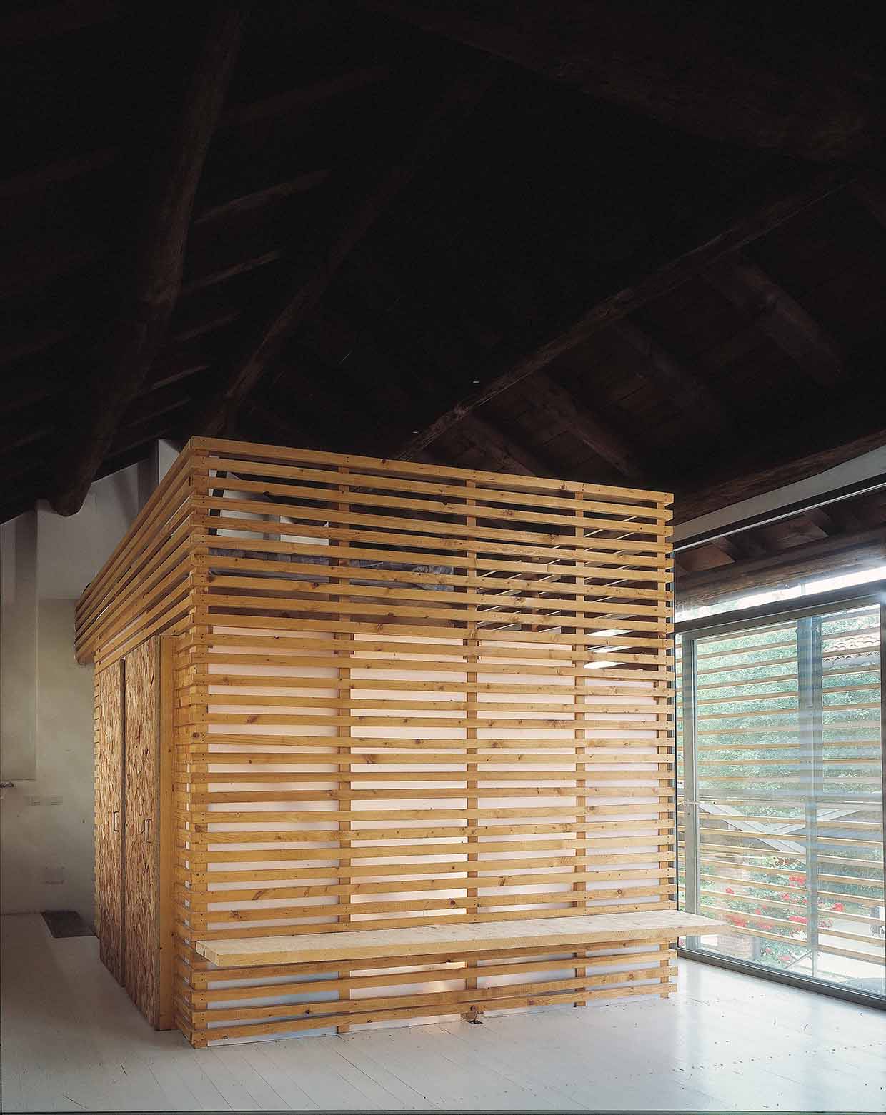 An old barn in a village on the outskirts of Milan is repurposed as home for two people. The main focus of the project was to realize a single large room flooded with daylight where life in the house can be played out. The perimeter bays of the barn have been closed with large glass windows and doors (5 x 3 m) and to the east a wooden sunblind allows to modulate the light. Indoors a box containing the bathroom with a bed on top is placed like an object that does not alter the original scale of the space. The existing brick honeycomb-shaped west-façade and the wooden sunblind on the east-façade filter light and shade that interact as the day unfolds.