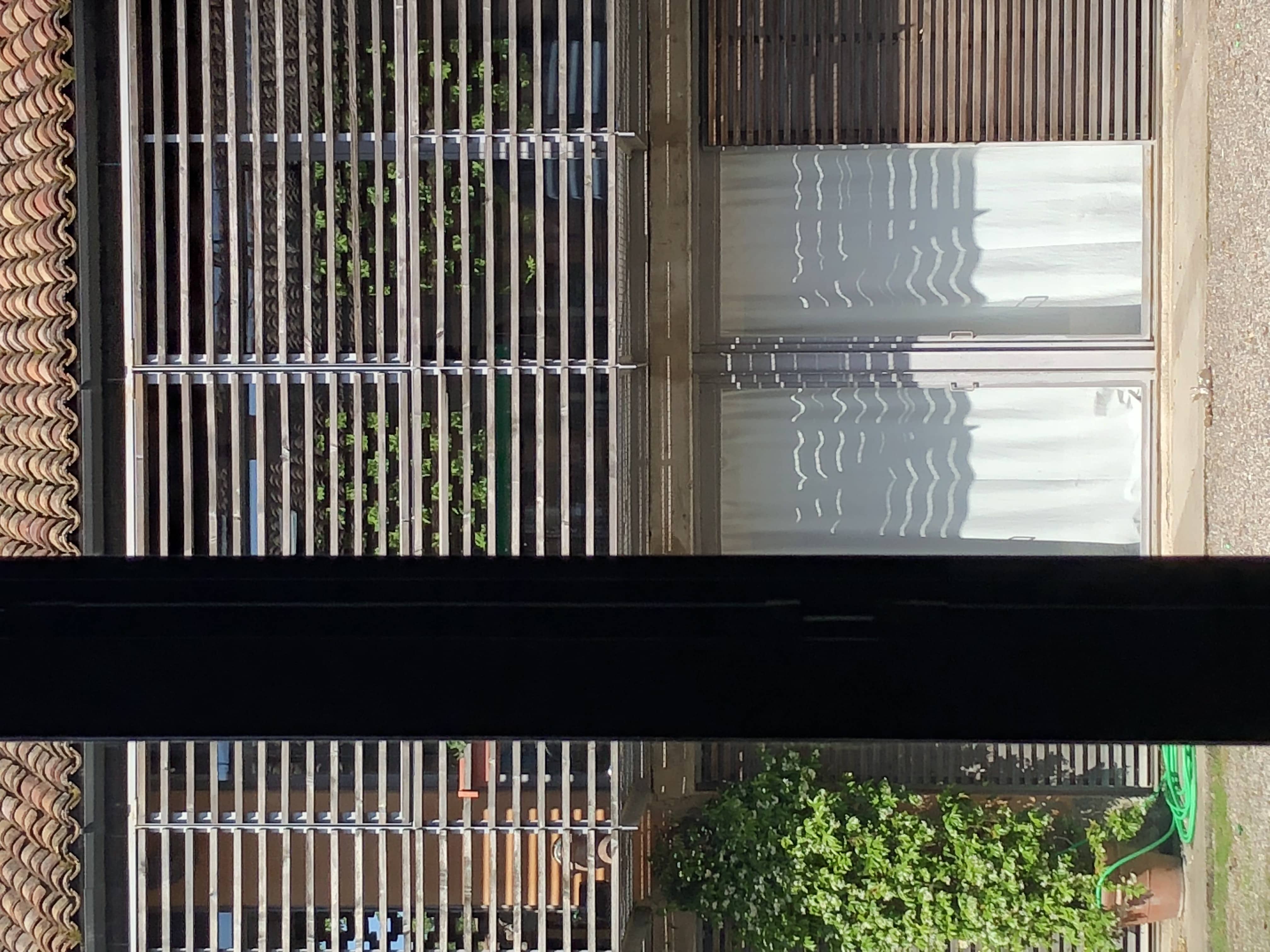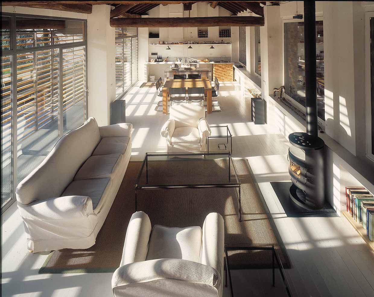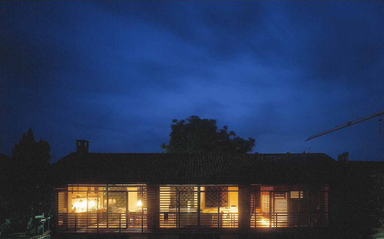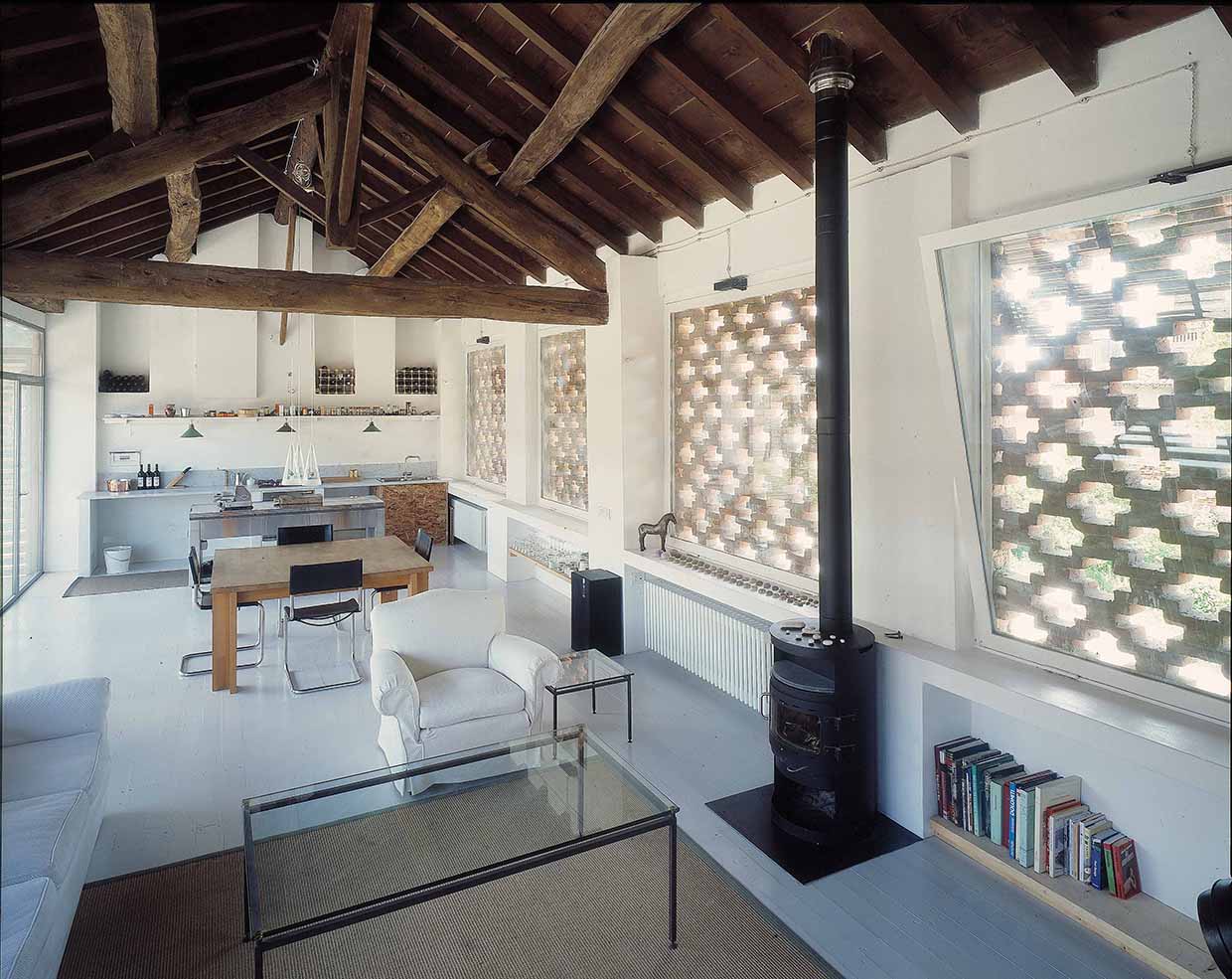 An old barn in a village on the outskirts of Milan is repurposed as home for two people. The main focus of the project was to realize a single large room flooded with daylight where life in the house can be played out. The perimeter bays of the barn have been closed with large glass windows and doors (5 x 3 m) and to the east a wooden sunblind allows to modulate the light. Indoors a box containing the bathroom with a bed on top is placed like an object that does not alter the original scale of the space. The existing brick honeycomb-shaped west-façade and the wooden sunblind on the east-façade filter light and shade that interact as the day unfolds.