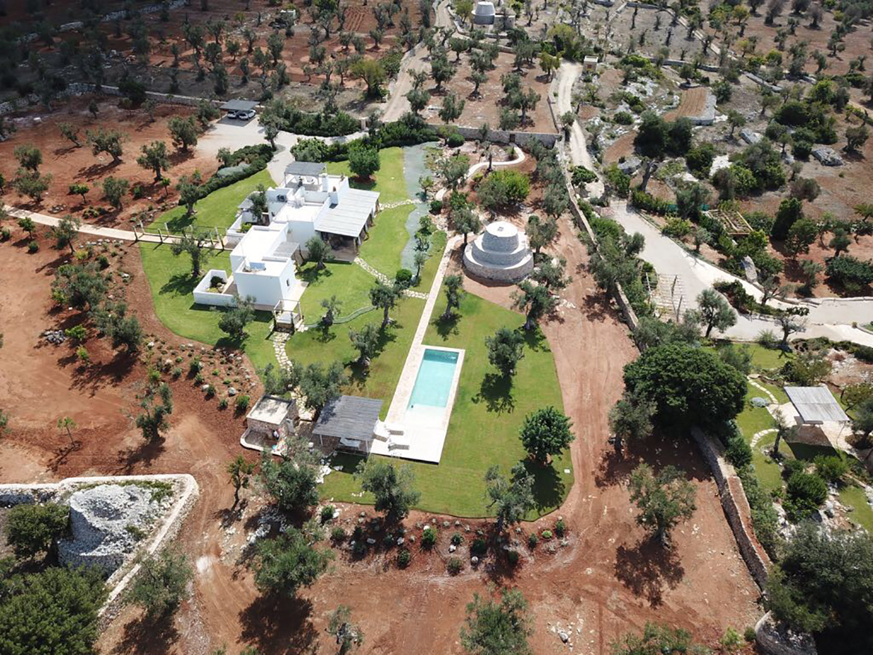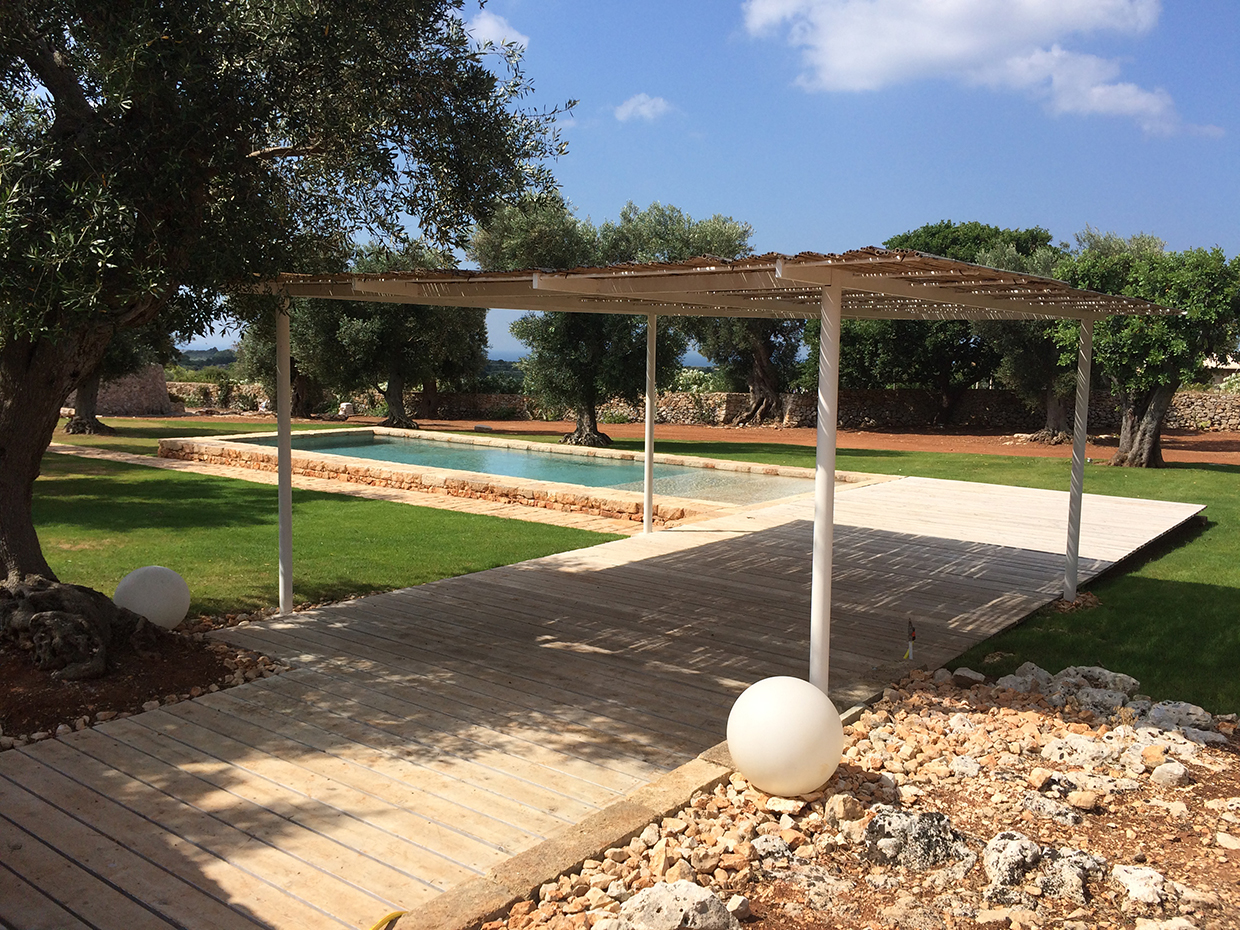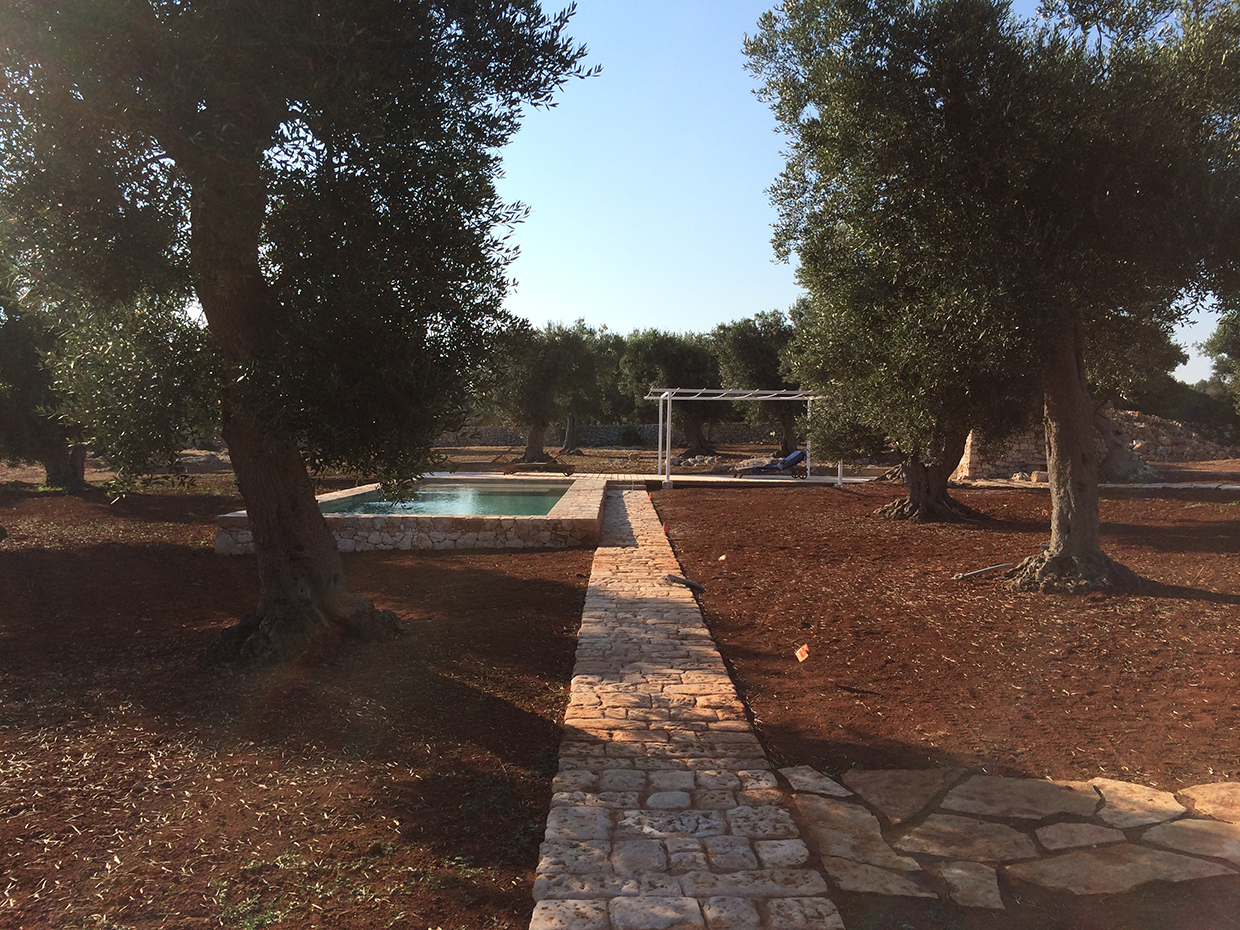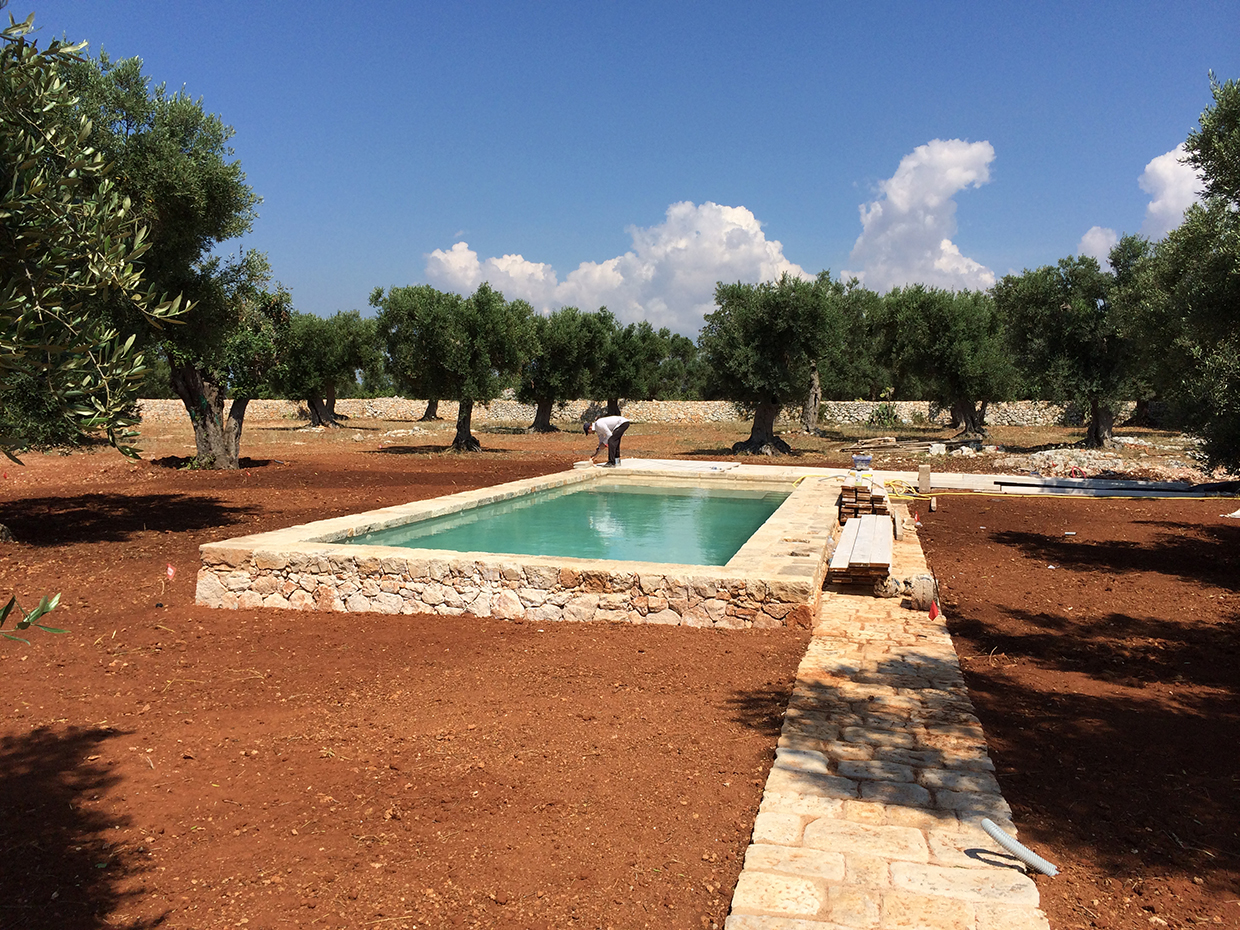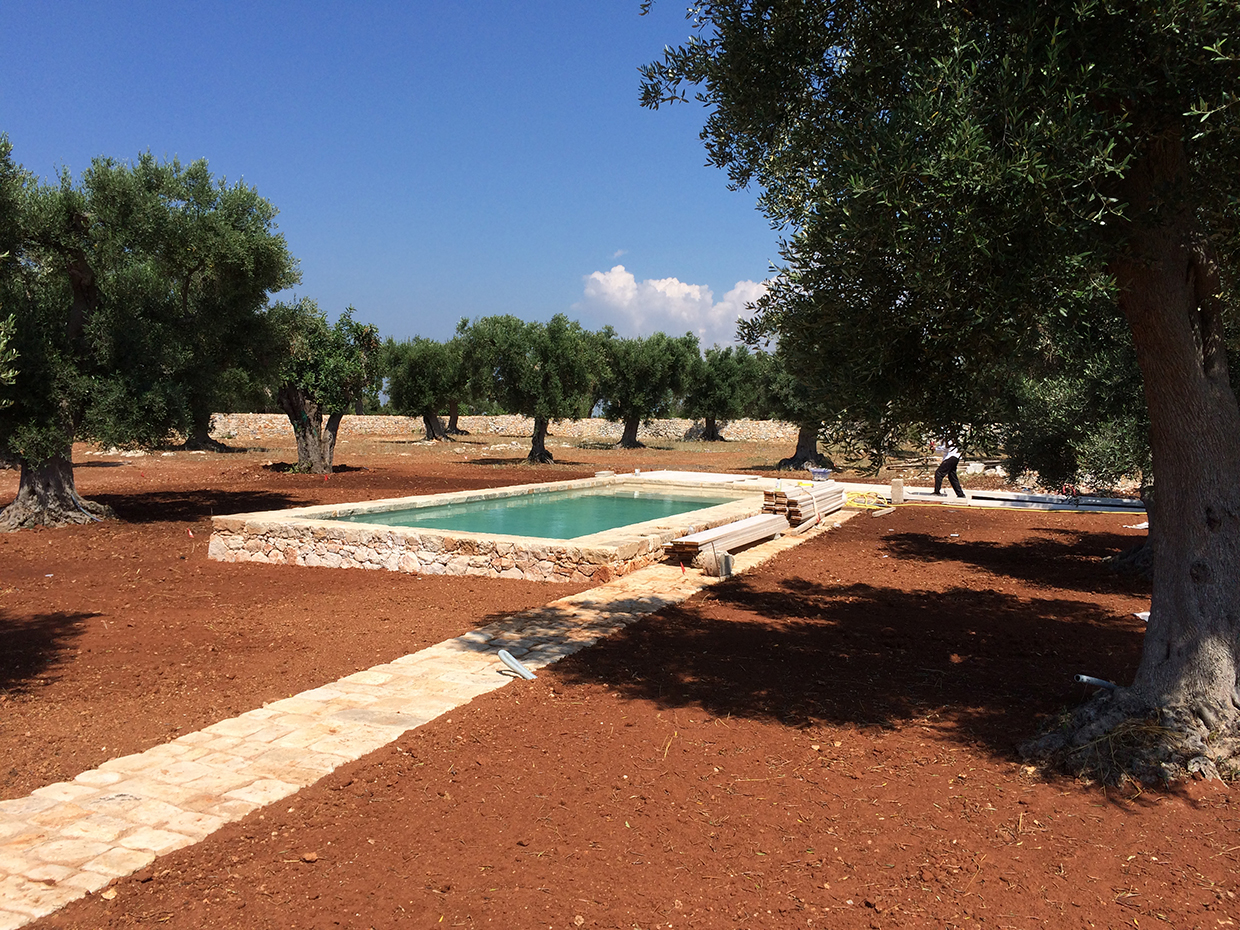 Swimming pool project for a house in Salento. The edge of the tank is lined with split stone in order to recall the dry stone-walls surrounding the olive grove where the swimming pool is located and it is positioned in relation with the existing "pajara" (ancient one-volume dry stone building traditional to the area).