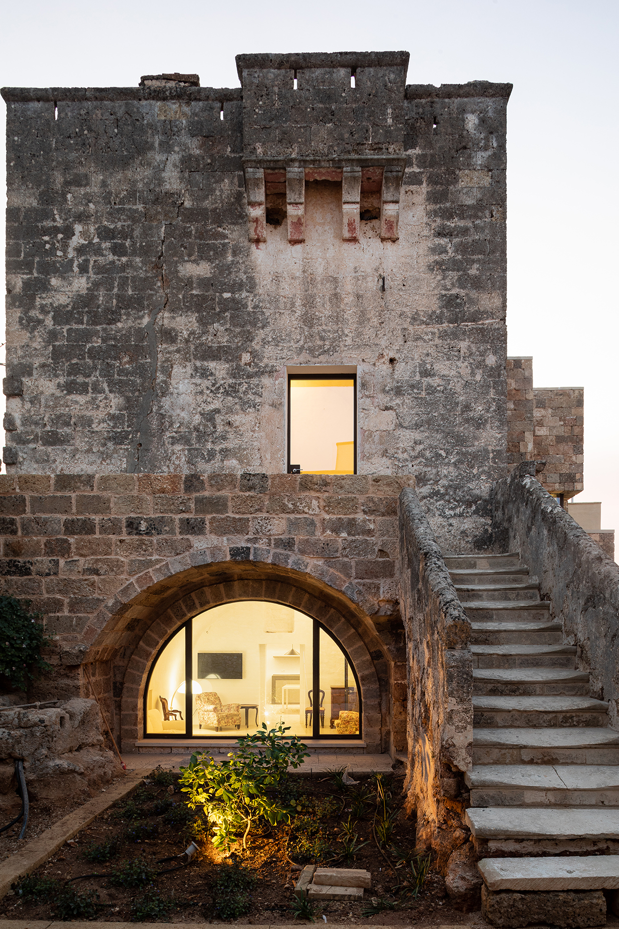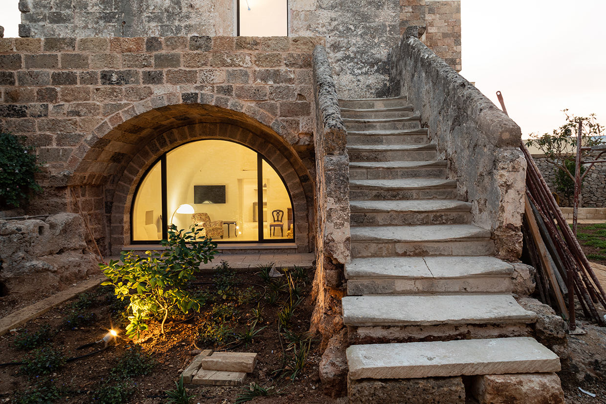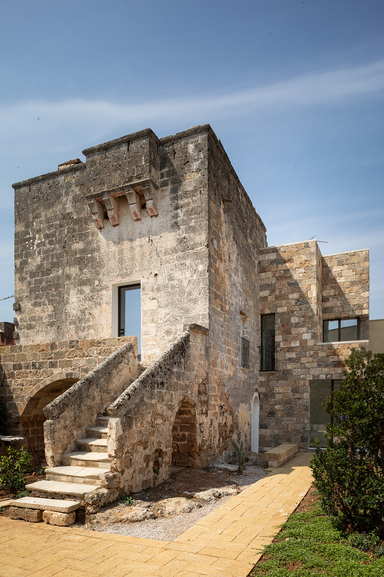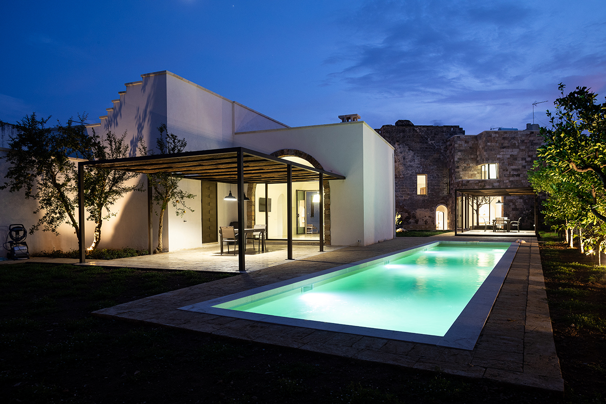The property, an ancient tower and a small masseria (fortified farmhouse) surrounded by land, is located in Gemini’s historic core, a village in southern Salento (Apulia). The project aims to renovate and enlarge the tower and the masseria, to transform the land into a garden and to realize a swimming pool. The tower needed internal stairs and facilities that were added in a small annex, which allowed not tampering the tower. The new body also establishes a new relation with the garden. Old tuff recovered locally was used as façade cladding thereby obtaining a mimesis with the pre-existing buildings. The transformation of the vegetable garden into a garden with swimming pool induces opening to new views. Thus the masseria has also undergone modifications to face it towards the garden. Both buildings are planned as autonomous dwellings.