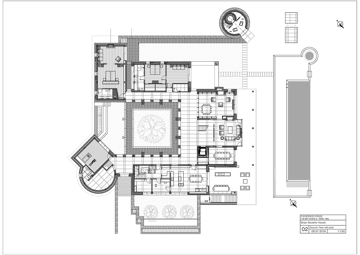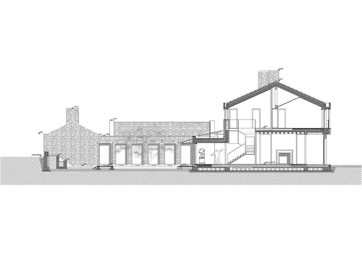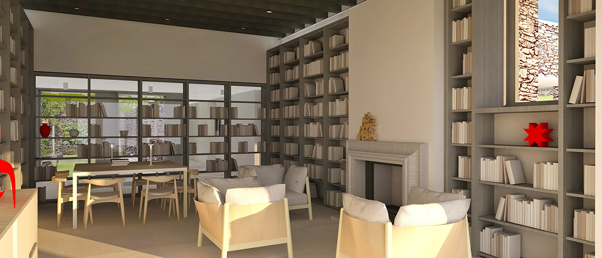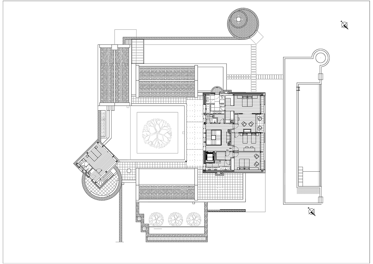 House II: the rooms of the house are conceived as if they were a small village consisting of distinct bodies connected through the central courtyard, like a rural agglomeration grown spontaneously. Access is from the court, which leads to the different parts of the house. In the main two-floor building the living room and library are on the ground floor whereas the owner’s family residence is on the upper-floor. The guest suites develop around the court as also the kitchen and service facilities, a gym and an apartment for the staff.