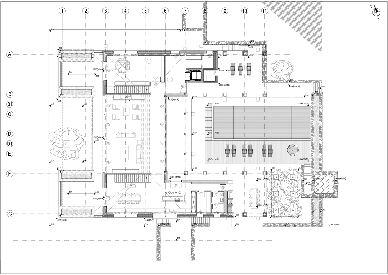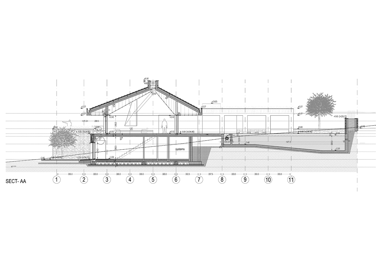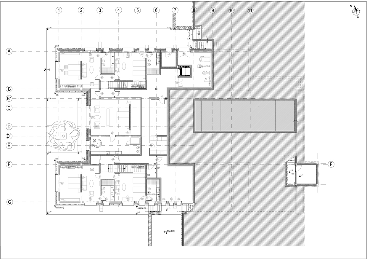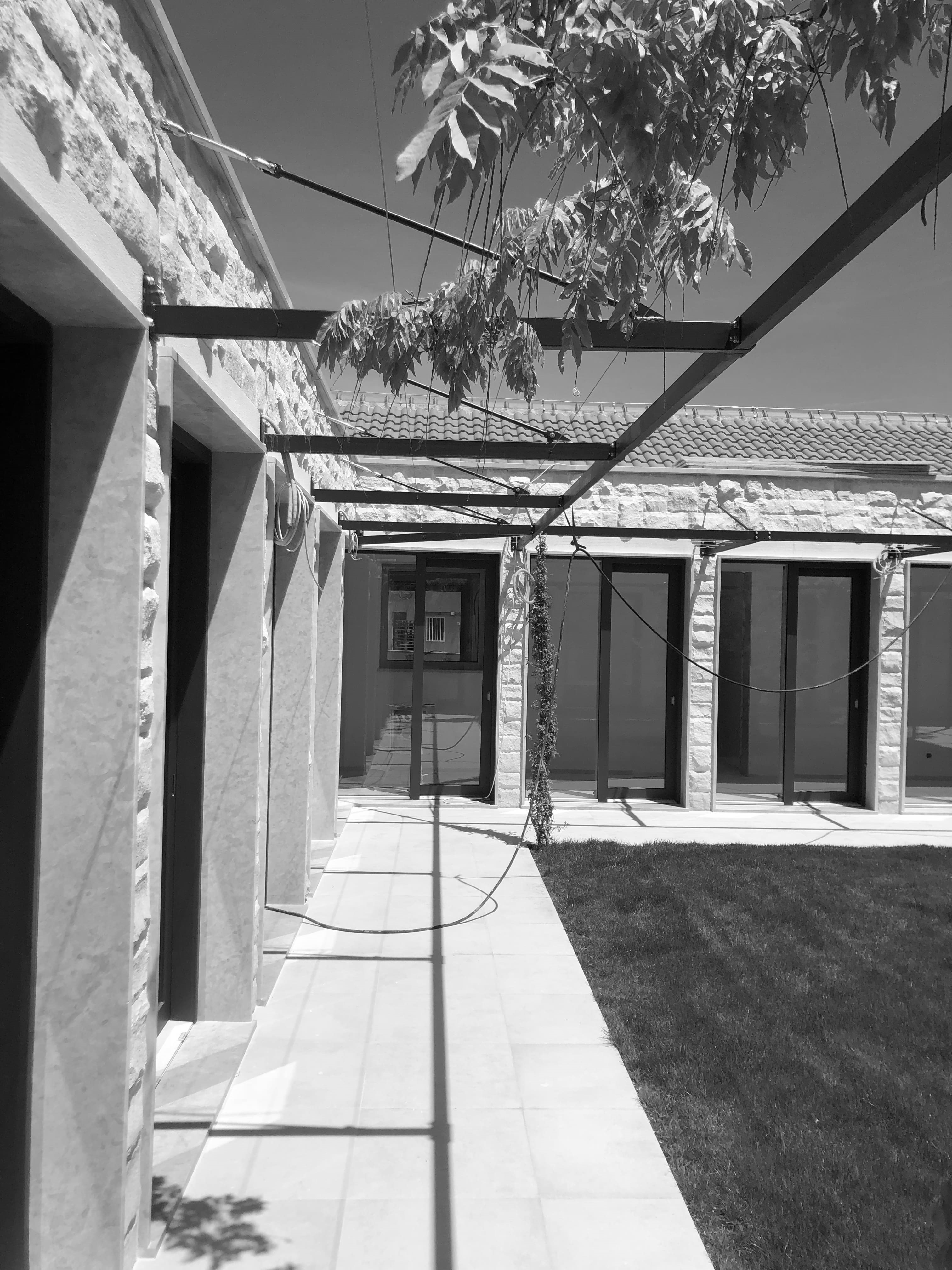 House II: the rooms of the house are conceived as if they were a small village consisting of distinct bodies connected through the central courtyard, like a rural agglomeration grown spontaneously. Access is from the court, which leads to the different parts of the house. In the main two-floor building the living room and library are on the ground floor whereas the owner’s family residence is on the upper-floor. The guest suites develop around the court as also the kitchen and service facilities, a gym and an apartment for the staff.