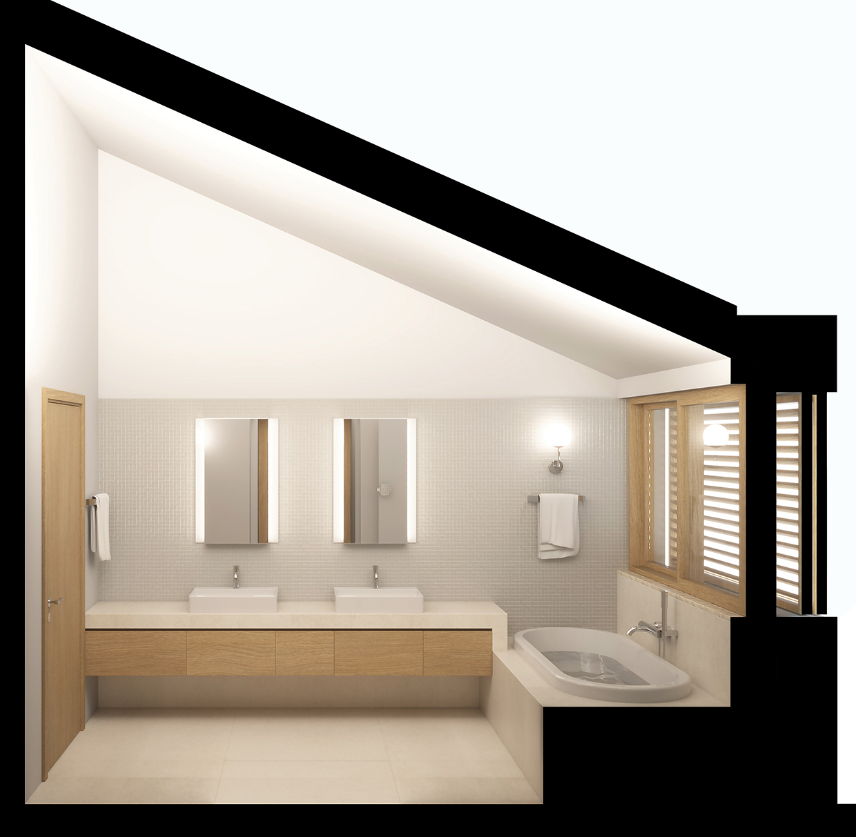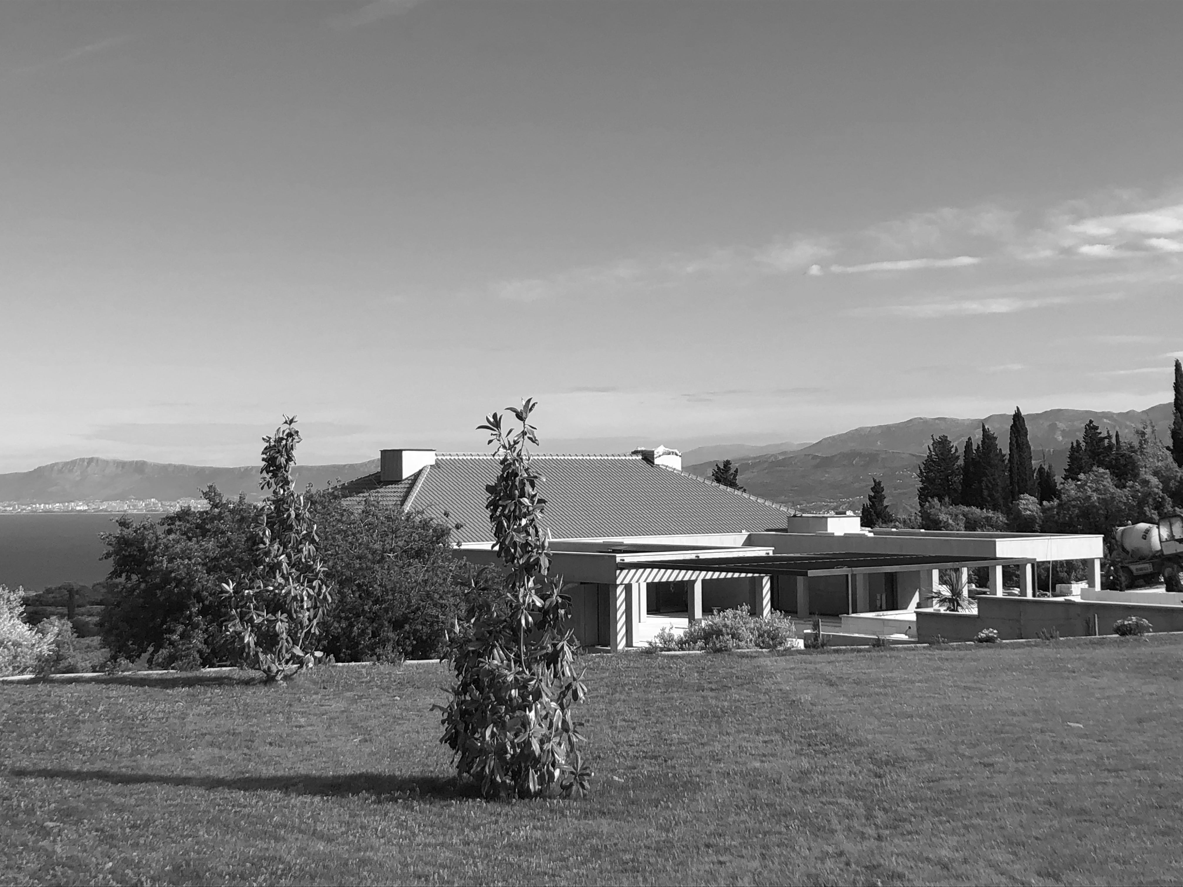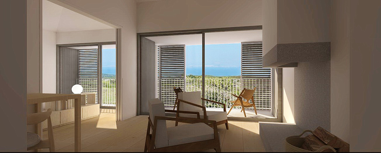 House I: descending from up-hill one accesses the house by entering a patio — characterized by a large swimming pool — which leads into a vast living room. Exploiting the natural incline of the land the living room is displayed as if it were a tribune looking out over the seascape. Conceived as two parallel wings connected by a central body, guest apartments and master suites on the ground floor have direct garden access thereby enjoying privacy.